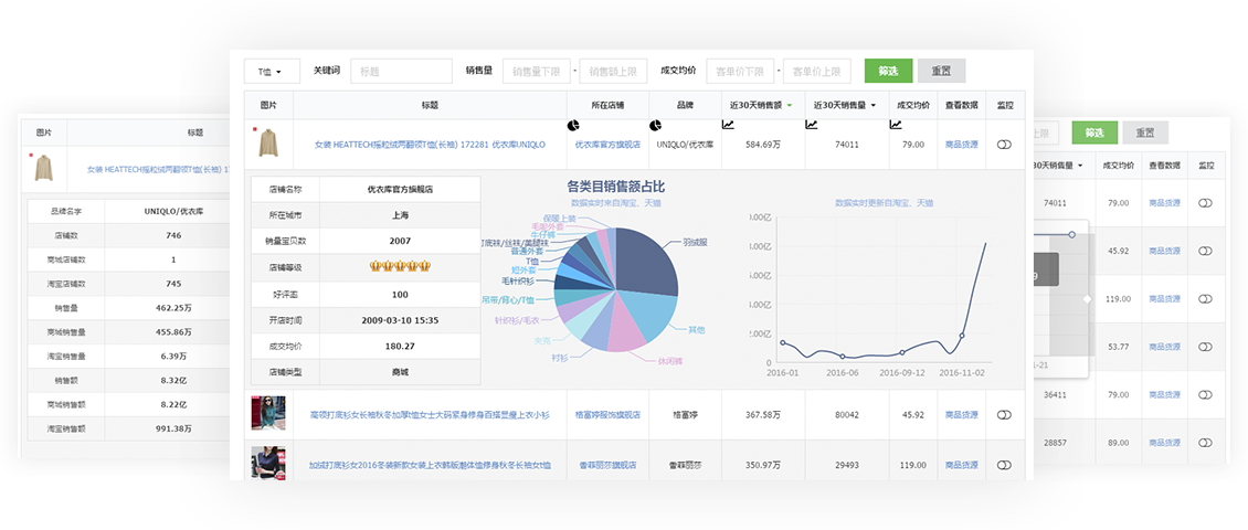 了解行业细分市场,监控市场数据变化,发现行业优秀店铺和标杆商品。